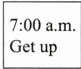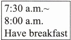 | 7:00 a.m. Get up | 7:30 a.m.~8:00 a.m. Have breakfast | 8:00 a.m.~8:20 a.m. Walk to school |