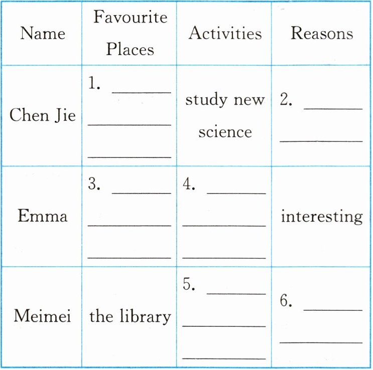 | Chen Jie | 1. ____ | study new science | 2. ____ |