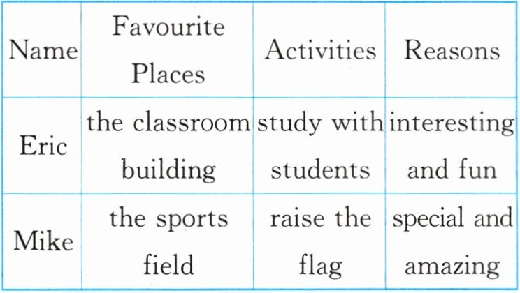 一、1. 说明文 2. 第三人称 3. 一般现在时 范文:We study in a very great school. There are many buildings in the school. Now let me tell you something about our school. There is a classroom building and it's Eric's favourite place. Because he can study with the classmates there. He thinks it is interesting and fun. Mike's favourite place is the sports field. Every Monday the students raise the flag in the sports field and Mike thinks it is special and amazing. All in all,we can learn a lot from the school and have a lot of fun there.