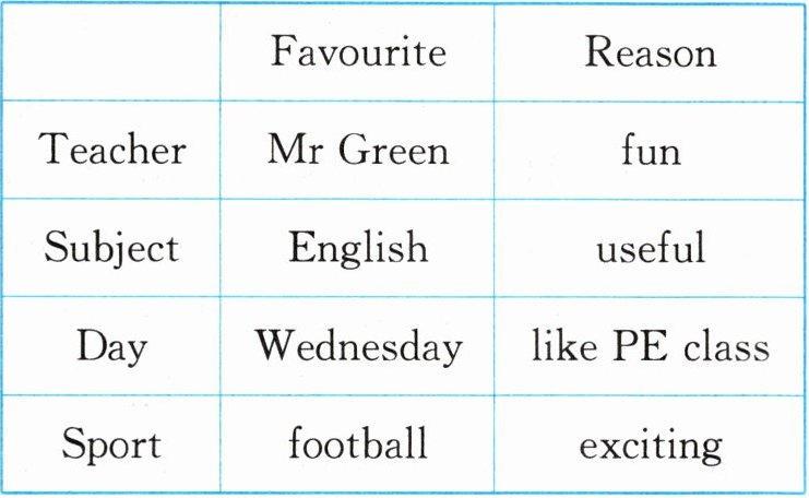 |中心|陈述要点,给出原因|Her favourite subject is …,because … … are her favourite …,because they are … Her favourite subject/teacher is … She likes … She thinks … … makes her …|