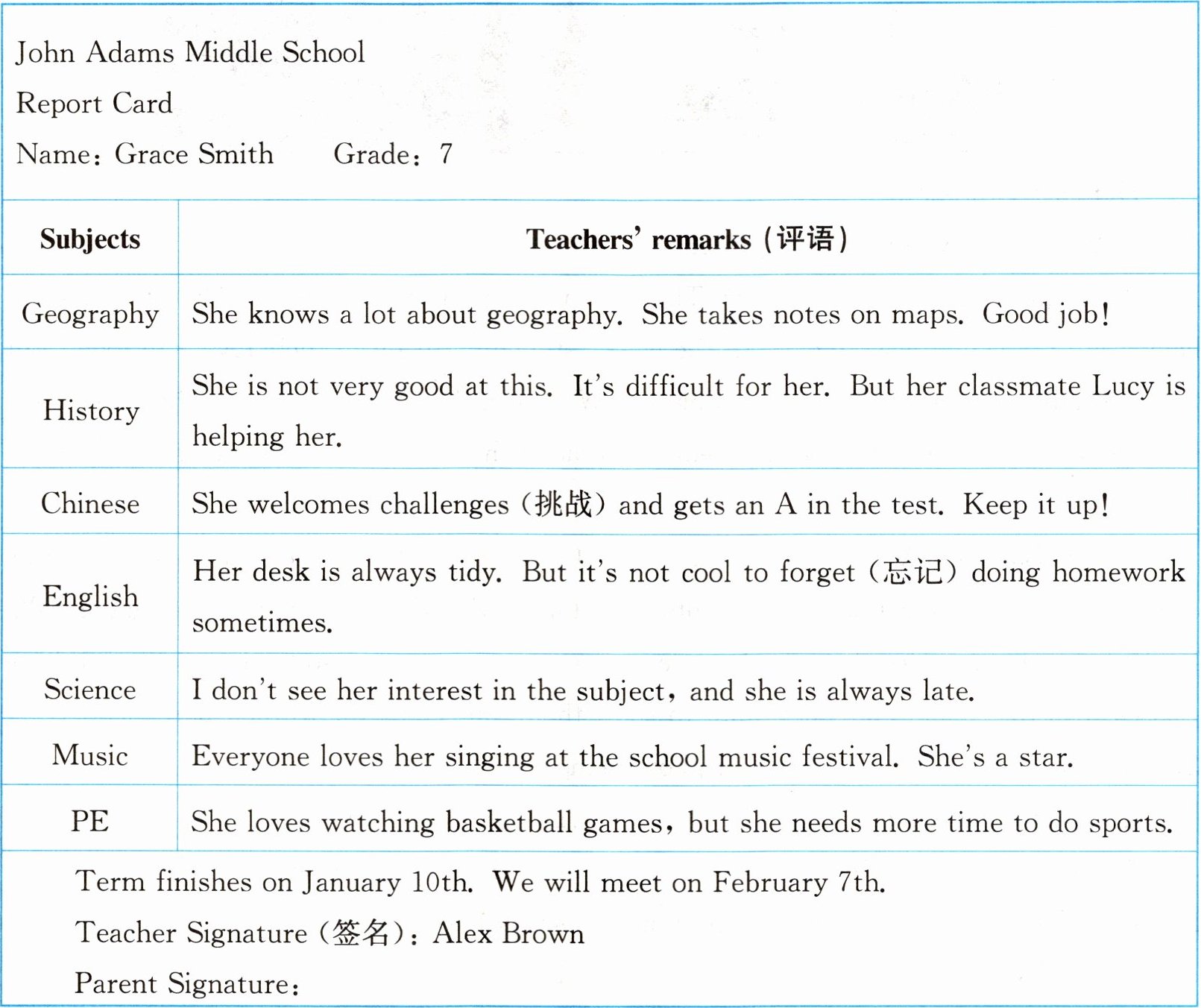 | Chinese | She welcomes challenges (挑战) and gets an A in the test. Keep it up! |
