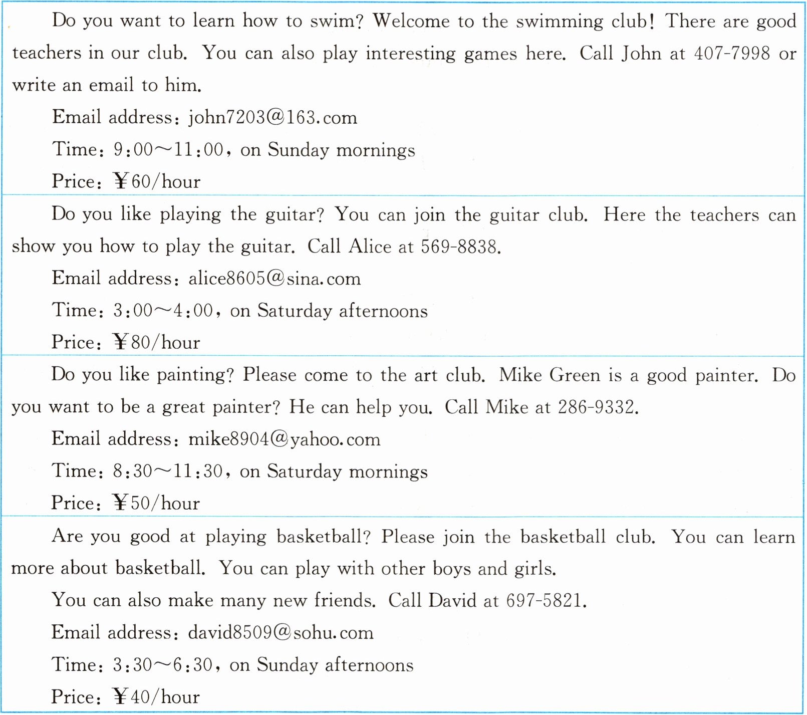 I come to a new school this term. This school has many clubs and I want to join some clubs. I really like music. I can play the guitar and I can play it well. So I want to join the music club. I want to play at the school party one day. I'm also good at drawing pictures. Art is my favourite subject. So the art club is fine for me, too. Many people like Picasso's pictures, but I don't like them, because they are very strange (奇怪的). I speak English and I can't speak any foreign languages (外语), so I also want to join the Chinese club.