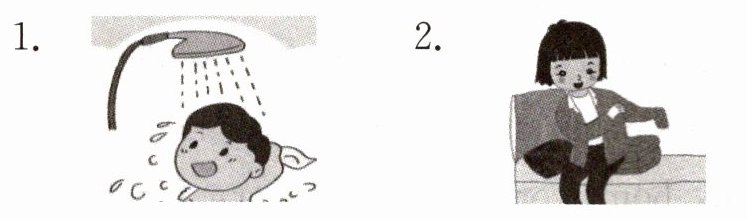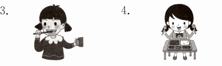 Ⅱ.任务一:1. take a shower 2. get dressed 3. brush (her) teeth 4. have breakfast 任务二:示例:1. a quarter past seven/ seven fifteen;I usually brush my teeth at seven fifteen. 2. half past nine/ nine thirty;I always do exercise at half past nine. 3. a quarter to eleven/ ten forty-five;I have Chinese at a quarter to eleven. 4. eight past twelve/ twelve eight;I have lunch at eight past twelve.