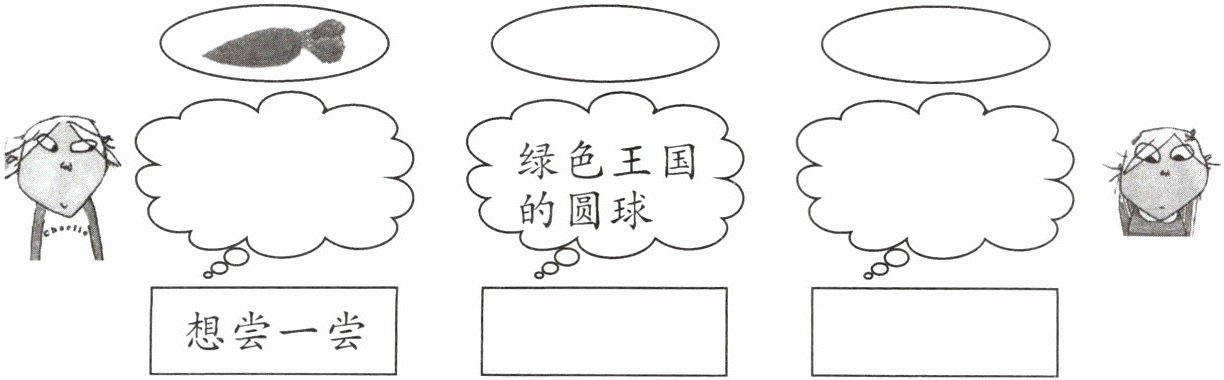 所以,从左到右依次填:“这是木星上来的橘树枝”;画豌豆,“这是绿色王国的小珍珠”;画西兰花,“这是从绿色森林里采来的大树”(答案不唯一,只要符合书中哥哥把蔬菜想象成有趣事物让罗拉吃的逻辑即可)。