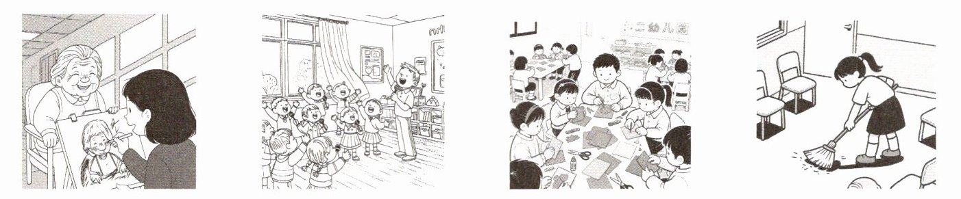 On Community Volunteers’ Day, students are doing volunteer jobs. In the old people’s home, Xiaoping is drawing a picture of Mrs Hu. Xiaohong is sweeping the floor. In the kindergarten, Xiaogao and Class One are making cards together. Xiaojun and Class Two are singing songs. They are all happy to help.