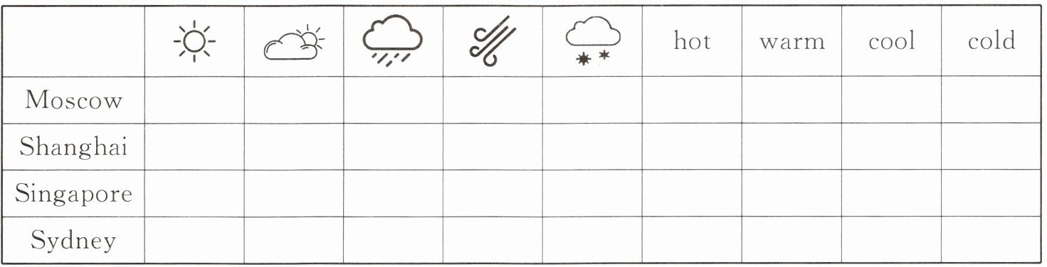 Good morning! Here’s the world weather. In Moscow, it’s $-2^{\circ}C$ and snowy. In Shanghai, it’s cold but sunny. Today it’s windy and rainy in Singapore and it’s $25^{\circ}C$. In Sydney, it’s hot and cloudy. Thank you!