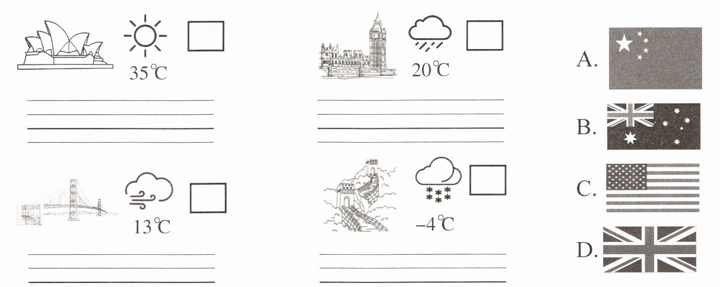 一、根据图片选择相应的国旗,并描述图中天气。