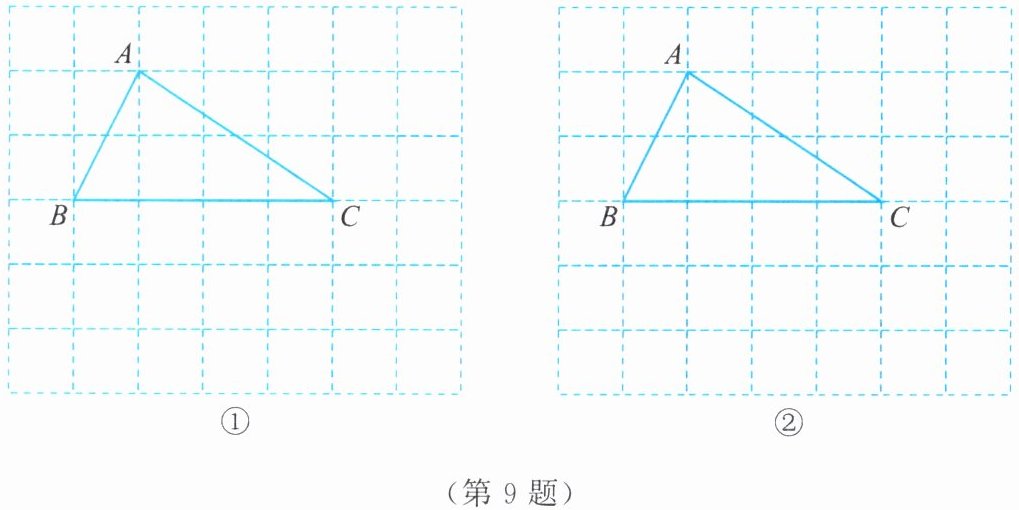 9. 如图,△ABC的三个顶点A,B,C均在小方格的顶点上。请在图中画出一个符合条件的三角形,且三角形的顶点均在小方格的顶点上。