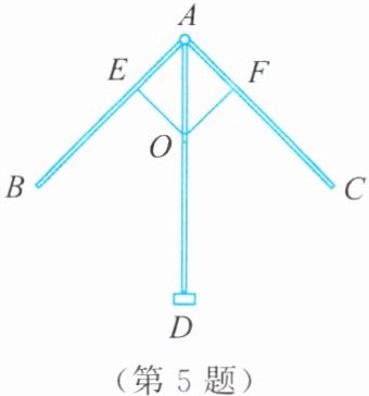 5. 某雨伞的轴截面如图所示,伞骨$AB = AC$,支撑杆$OE = OF$,$AE= \frac{1}{3}AB$,$AF= \frac{1}{3}AC$。当点$O沿AD$滑动时,雨伞开闭。问:雨伞开闭过程中,$\angle BAD与\angle CAD$有何关系?请说明理由。