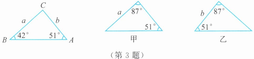 3. 如图,已知$\triangle ABC$的两条边和两个角,甲、乙两个图形的一条边和两个角,则下列说法正确的是(