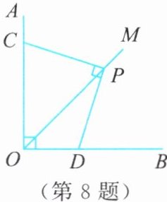 8. 如图,已知$\angle AOB = 90^{\circ}$,$P是\angle AOB的平分线OM$上一点。在射线$OA$,$OB上分别取两点C$,$D$,连结$PC$,$PD$,使得$\angle CPD = 90^{\circ}$。请写出$PC和PD$之间的数量关系,并说明理由。