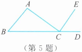 5. 如图,在 $ \triangle ABC $ 中,$ \angle B = 50^{\circ} $,$ \angle ACB = 35^{\circ} $。点 $ D $ 在 $ BC $ 的延长线上,过点 $ C $ 作 $ CE // AB $,求 $ \angle ACE $ 的度数。