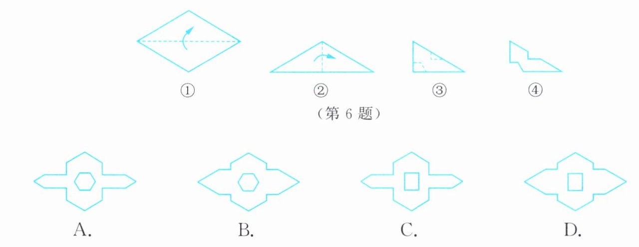 6. 剪纸是我国传统的民间艺术。如图①,②,先将一张纸片对折两次,再沿图③中的虚线裁剪,最后将图④中的纸片展开、铺平,所得图案应该是(