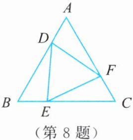 8. 小亮利用两张等边三角形纸片 $ \triangle ABC $ 和 $ \triangle DEF $ 拼成如图所示的图形,点 $ D $,$ E $,$ F $ 分别落在边 $ AB $,$ BC $,$ AC $ 上。经过探索,小亮发现 $ AD = BE = CF $。你同意小亮的看法吗?请说明理由。