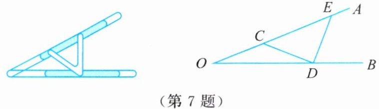 7. “三等分角”大约是在公元前五世纪由古希腊人提出来的。借助如图所示的“三等分角仪”能三等分任意角。这个三等分角仪由两根有槽的棒 $ OA $,$ OB $ 组成,两根棒在 $ O $ 点相连并可绕 $ O $ 转动,$ C $ 点固定,$ OC = CD = DE $,点 $ D $,$ E $ 可在槽中滑动。若 $ \angle BDE = 69° $,则 $ \angle CDE $ 的度数是(