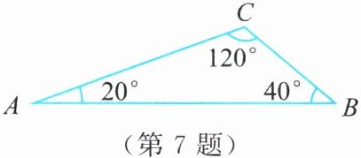 7. 如图,在$\triangle ABC$中,$\angle C = 120^{\circ}$,$\angle A = 20^{\circ}$,$\angle B = 40^{\circ}$。你能把这个三角形分成两个等腰三角形吗?画一画,标出各等腰三角形内角的度数。你有几种分法?