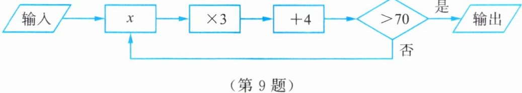 9. 按照如下程序,输入$x$的值并计算。规定从“输入一个数$x$”到“判断结果是否大于$70$”为一次程序操作。