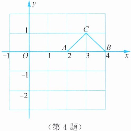 4. 如图,在直角坐标系中,等腰直角三角形ABC的顶点A,B的坐标分别为A(2,0),B(4,0)。将等腰直角三角形ABC沿x轴向左平移3个单位,使点A平移到点A′。在图中作出平移后的△A′B′C′,并写出△A′B′C′的顶点坐标。