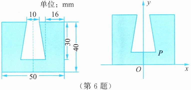 6. 小明为画一个零件的轴截面,以该轴截面的底边所在的直线为 $ x $ 轴,对称轴为 $ y $ 轴,建立如图所示的平面直角坐标系。若坐标轴的单位长度取 $ 1 \mathrm{~mm} $,则图中转折点 $ P $ 的坐标为(