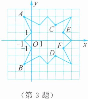 3. 如图所示的图案关于 $ x $ 轴对称。图案上点 $ A $ 与 $ B $,点 $ C $ 与 $ D $ 的横、纵坐标分别有什么关系?已知点 $ E $ 的坐标是 $ (4,1) $,写出点 $ F $ 的坐标。