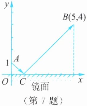 7. 如图,一束光线从点$A(0,1)$射出,经过$x轴上的点C(1,0)反射后经过点B(5,4)$。试求这束光线从点$A到点B$所经过的路程。