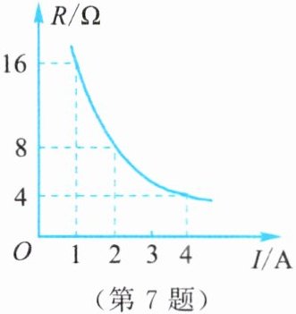 7. 如图是在固定的电压下,通过一电阻的电流 $ I(A) $ 与该电阻的阻值 $ R(\Omega) $ 之间的关系变化图。根据图象回答下列问题: