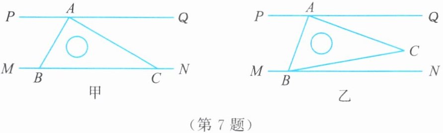 7. 如图,在三角板$ABC$中,$\angle BAC = 90^{\circ}$,$\angle ABC = 60^{\circ}$。将顶点$A$,$B分别放置在一组平行线PQ$,$MN$上,点$C在AB$的右侧。