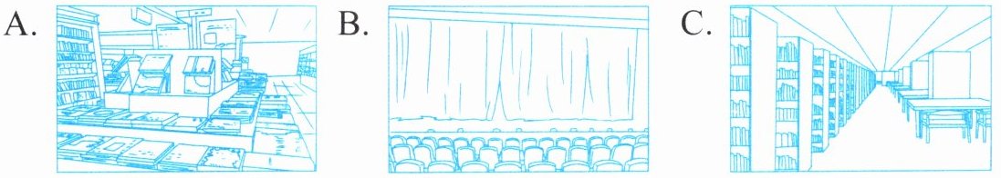 A. ![教室插图] B. ![电影院插图] C. ![图书馆插图]