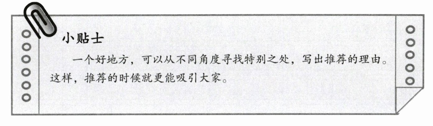 2. 你要推荐的好地方,有什么特别之处呢?你可以继续留心观察自己喜欢的好地方,找到推荐的理由。