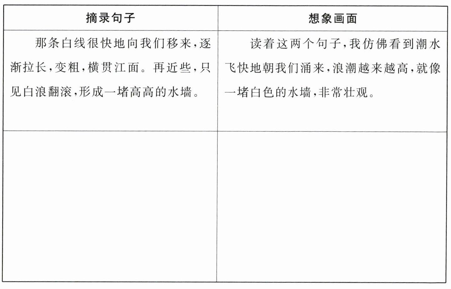 4. 默读课文第3-4自然段,摘录描写钱塘江大潮的语句,展开想象,你的脑海中仿佛出现了怎样的画面?选择印象最深的画面和同学交流。