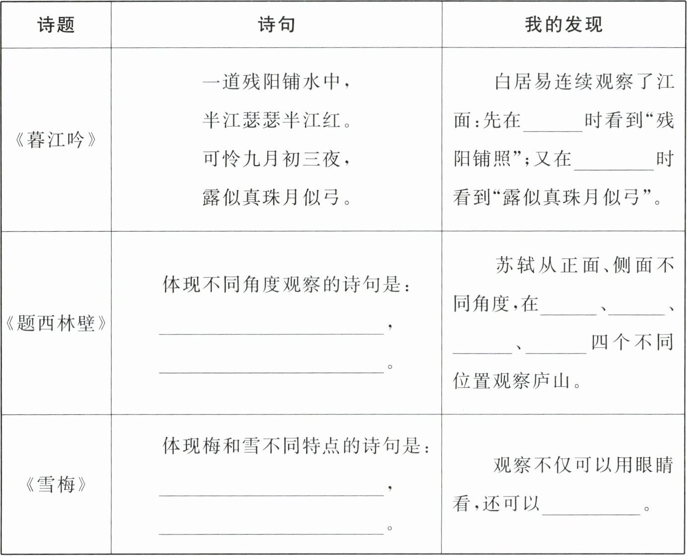 3. 默读《古诗三首》,想一想诗人是怎样观察的,填写下表,然后跟同学一起交流。
