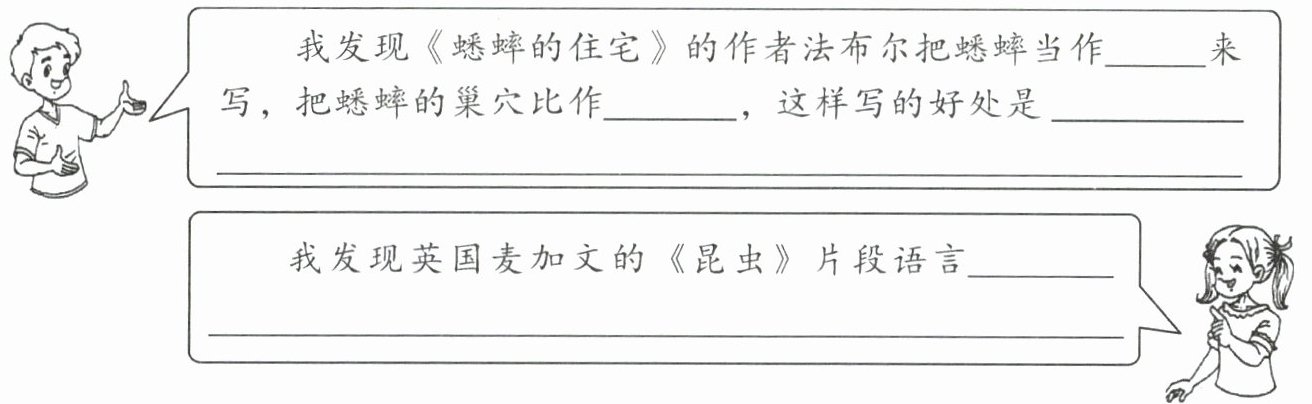 6. 《蟋蟀的住宅》和英国麦加文的《昆虫》在表达上有什么不同?默读教科书第41页第3题,跟同学交流你的发现。