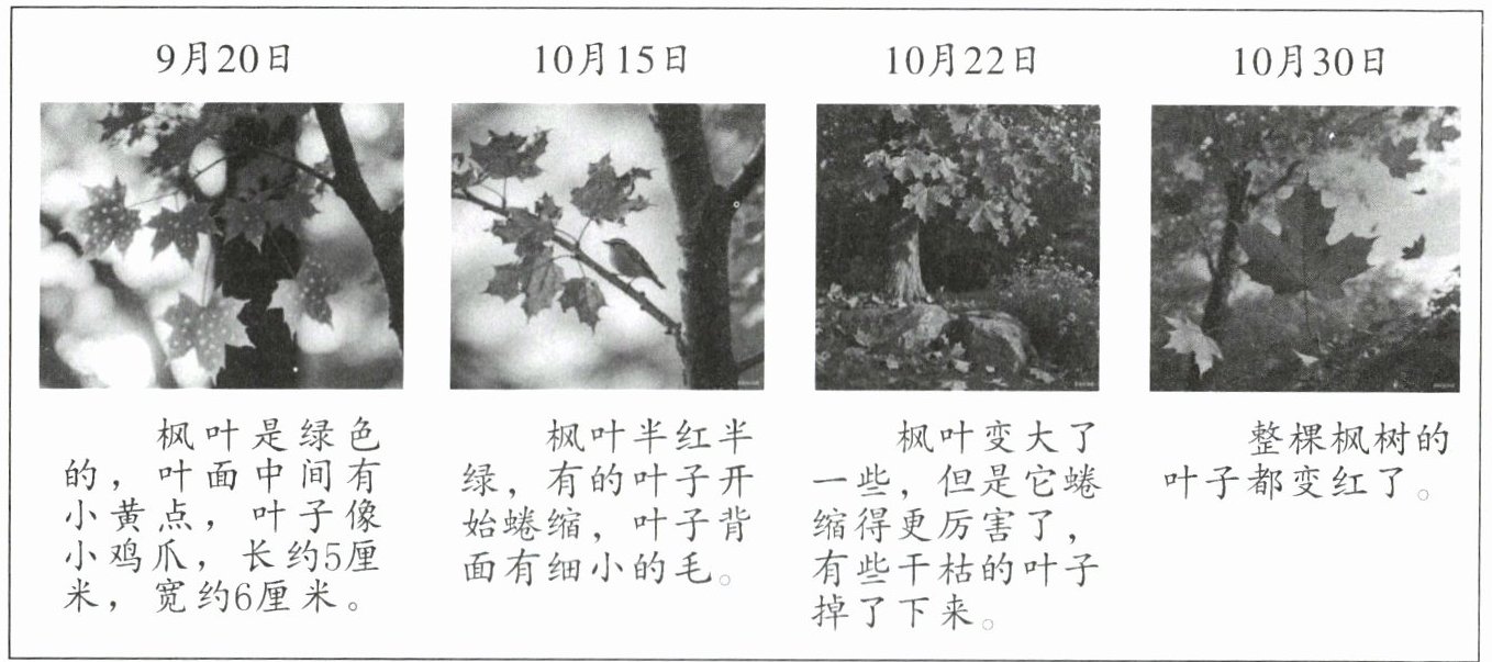 做观察记录时不仅可以关注枫叶颜色、大小等方面的变化,还可以用手摸摸,记录枫叶在触觉上的变化。