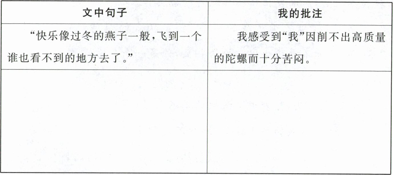 |我的批注|“我”对削不出高质量陀螺感到沮丧、失落,快乐都消失了。|