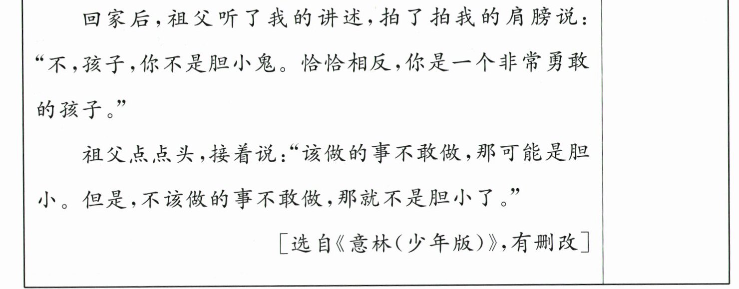 |祖父点点头,接着说:“该做的事不敢做,那可能是胆小。但是,不该做的事不敢做,那就不是胆小了。”|祖父的话点明主题,区分了真正的勇敢和胆小。|