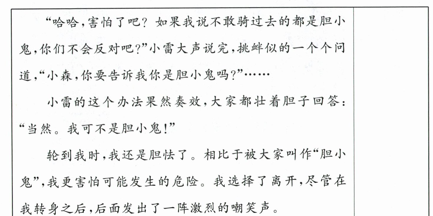 |“哈哈,害怕了吧?如果我说不敢骑过去的都是胆小鬼,你们不会反对吧?”小雷大声说完,挑衅似的一个个问道,“小森,你要告诉我你是胆小鬼吗?”......|小雷用激将法,推动情节发展。|
