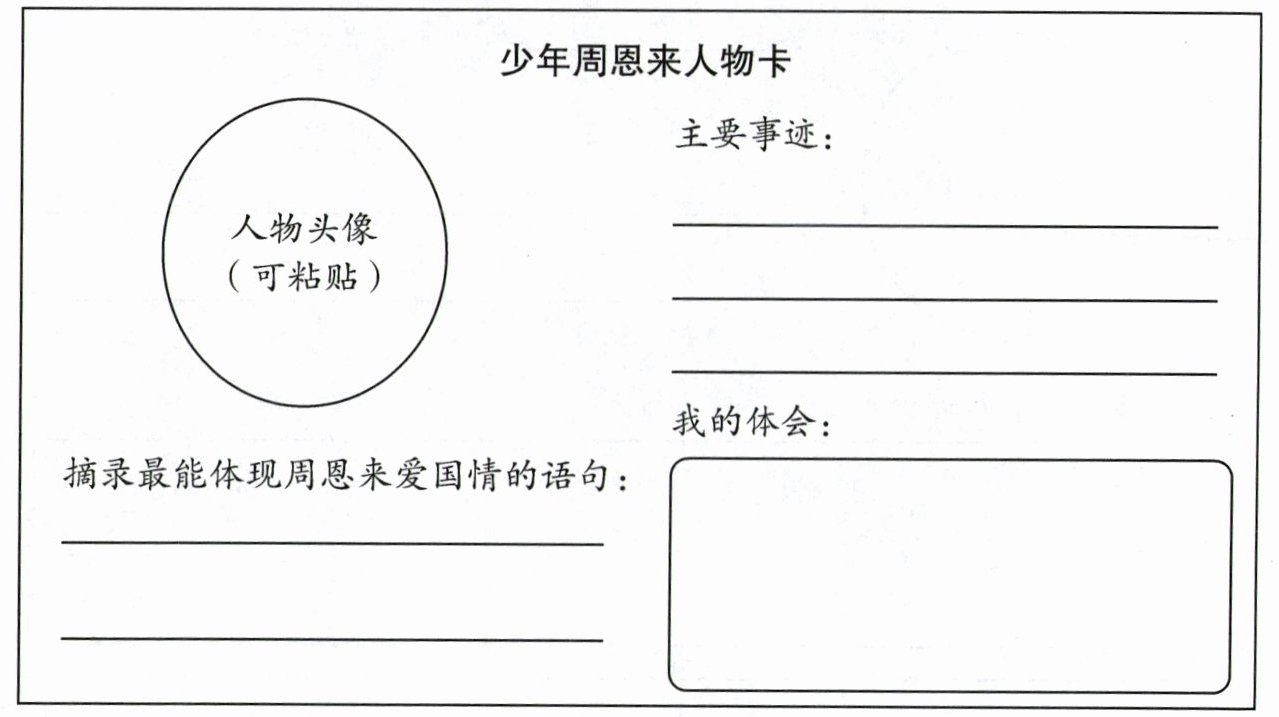 6. 1月8日是周恩来总理逝世纪念日,每年都会有许多游客到周恩来纪念馆缅怀周总理。结合课文《为中华之崛起而读书》,让我们制作一张少年周恩来的人物卡,再当当小小讲解员,讲讲少年周恩来的故事吧。
