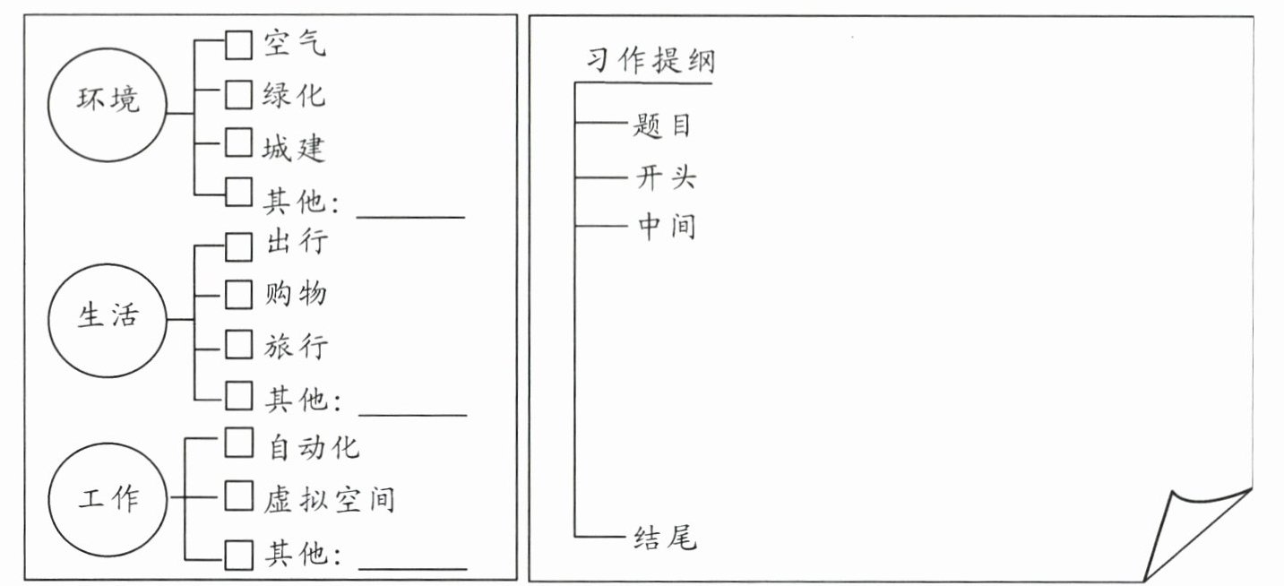 7. 如果穿越时空隧道,二十年后的家乡会发生怎样的巨变呢?如环境、工作、生活等有什么变化?请你在最希望发生变化的 3—4 个方面前的“□”中打“√”,然后把构思好的材料按照文章结构和段落进行有序排列,列出提纲。