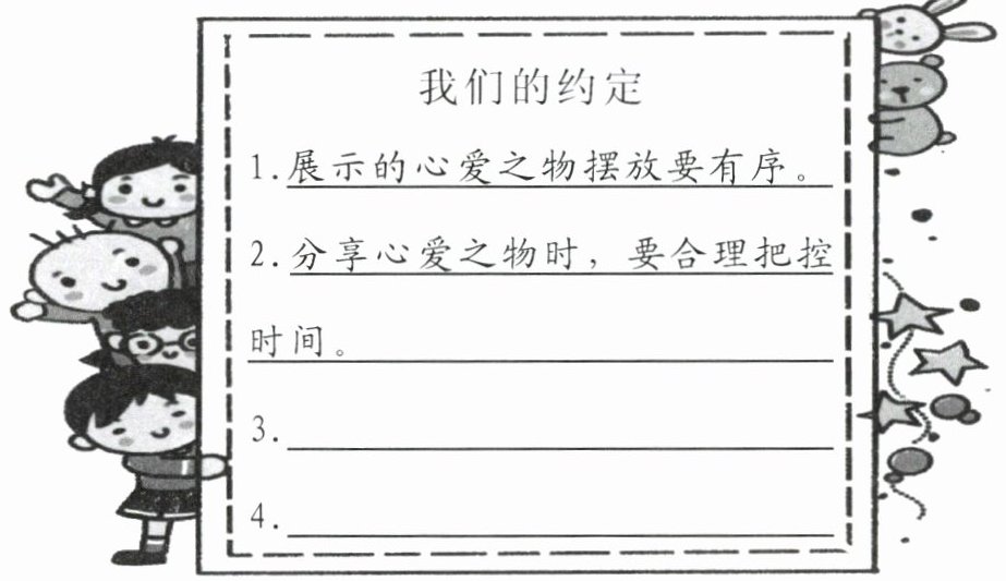 俗话说:“没有规矩,不成方圆。”公约,是集体共同制定、认可的规则。那么,在举办心爱之物展览会时,我们要注意什么呢?在组内讨论,整合一份你们小组的公约,最后形成我们班级展览的公约,为我们更有序地举办这次心爱之物展览会助力!