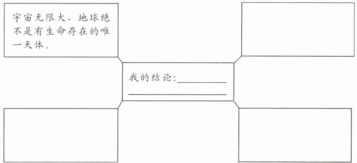 ③ 理由圈方框内容:生命存在需要适宜的温度、水分、大气和光热;太阳系中多数行星条件不适宜;火星未发现生命证据。我的结论:地球之外是否有生命存在仍是未解之谜。