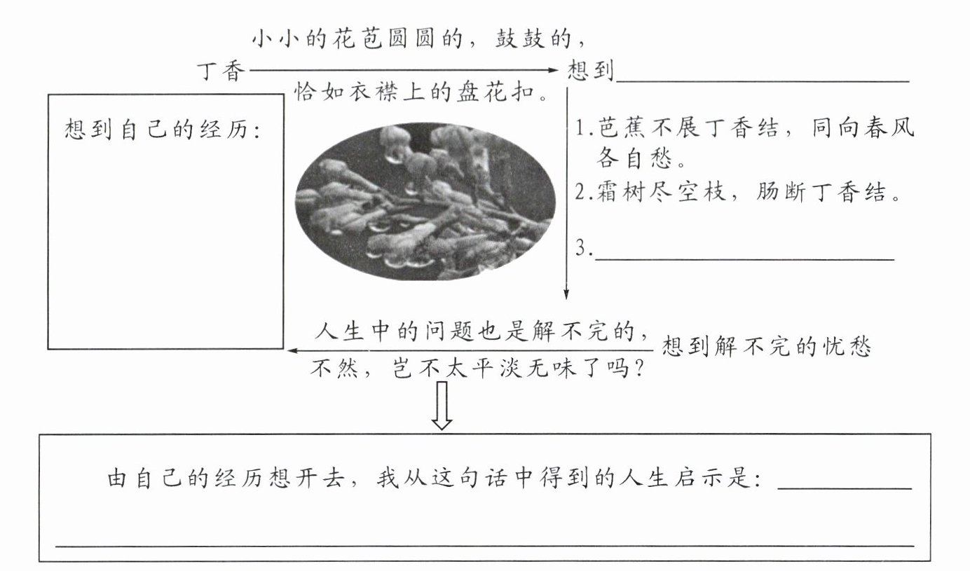 2. 丁香让人思绪万千。根据《丁香结》一文最后两个自然段填一填,感受丁香结的“愁”。