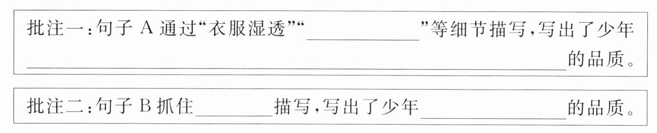 3. | 批注一:句子A通过"衣服湿透""胳膊肘有血痕"等细节描写,写出了少年吃苦耐劳、有责任心的品质。 |