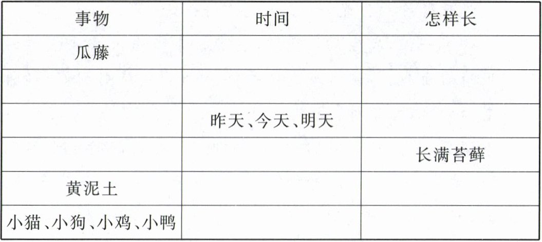 (1)示例:你去菜园看豆角藤,一夜之间,藤蔓就爬上了竹架,还开出了淡紫色的小花。