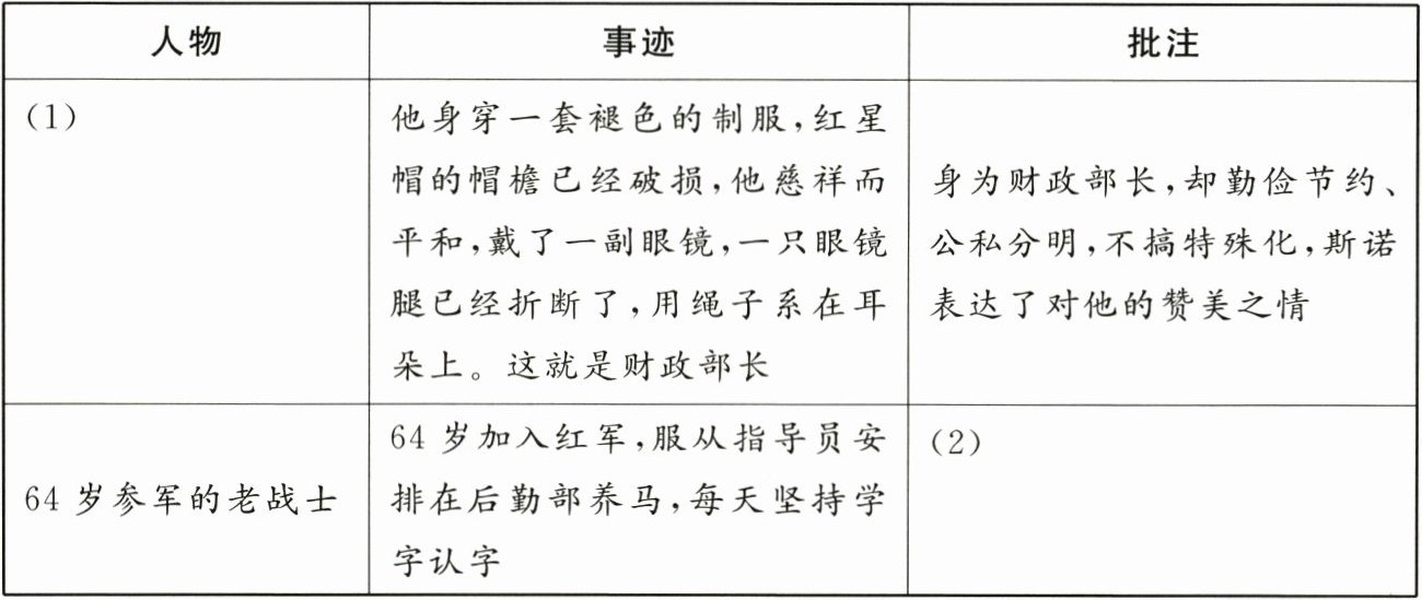 13. 《红星照耀中国》中,斯诺关注到红军将领和普通士兵身上独特的精神品质,请填写下面的表格。