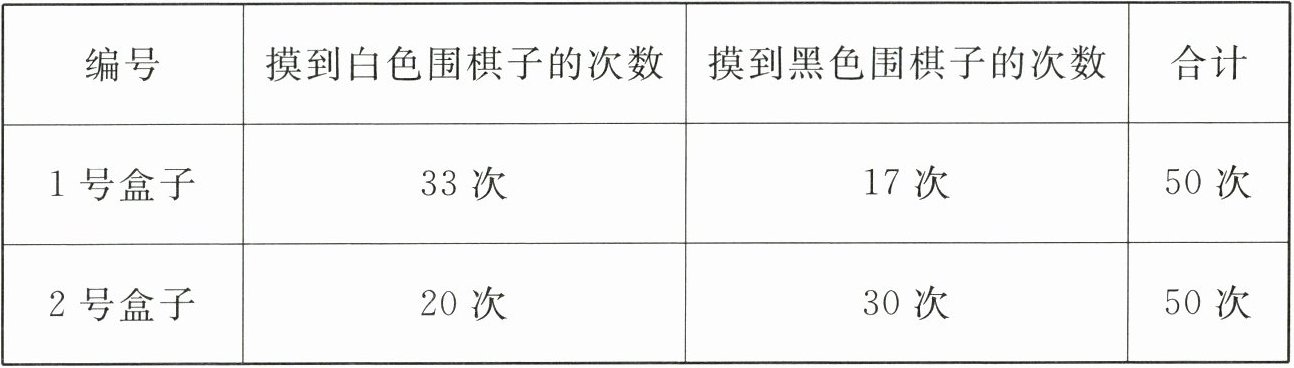 |编号|摸到白色围棋子的次数|摸到黑色围棋子的次数|合计|