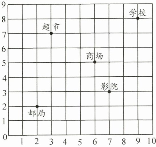 (1)学校(9,8) 超市(3,7) 影院(7,3) 商场(6,5) 邮局(2,2)