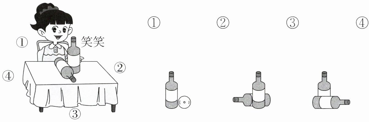 从笑笑所在的①号位置看到的是瓶子的背面,对应右边的第三幅图;