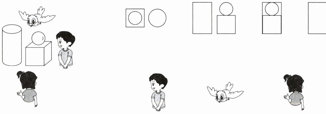 左侧女孩连从左往右数第四个图(正方形和圆上下组合的图);中间男孩连从左往右数第一个图(两个圆);右侧女孩连从左往右数第三个图(圆在正方形上面的图)。