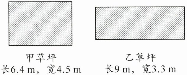 估算:甲草坪面积,$6.4\approx6$,$4.5\approx5$,$6×5 = 30(m^{2})$;乙草坪面积,$9\approx10$,$3.3\approx3$,$10×3 = 30(m^{2})$,但$6.4\lt6.5$取近似$6$偏小,$4.5$取近似$5$偏大,$9$取近似$10$偏大,$3.3$取近似$3$偏小,实际比较$6.4×4.5$与$9×3.3$。