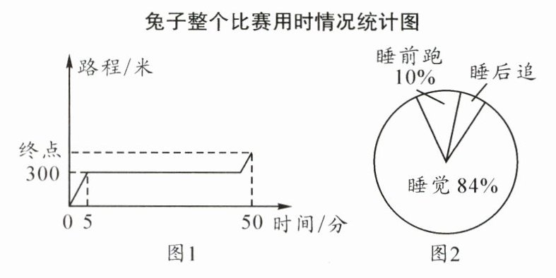 3. 如图1,龟兔赛跑时,兔子先跑了5分钟,正好跑了300米,这时它觉得乌龟的速度太慢,于是就睡觉了。当兔子醒来,发现乌龟已超过它,便立即用原来的速度去追,但已经追不上乌龟了。兔子从起点到终点用时50分钟,用时情况如图2所示。